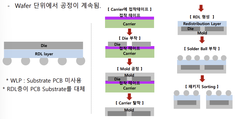 - CARRIER에 접착테이프 -> DIE 부착 -> MOLD 공정 -> CARRIER 탈착 -> RDL 형성 -> SOLDER BALL 부착 -> 패키지 SORTING