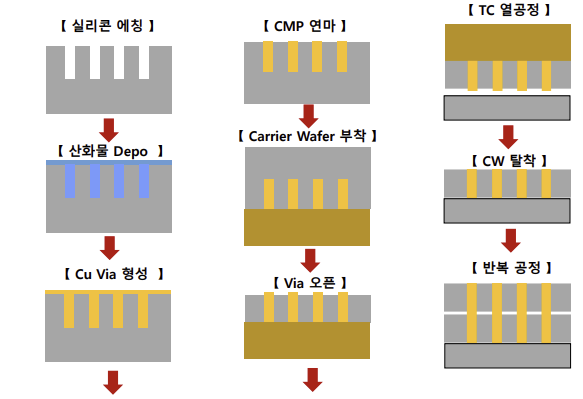 - WAFER에 TSV를 형성한 후 연삭 등의 공정을 거친 후 겹겹이 쌓는 방식으로 진행된다.