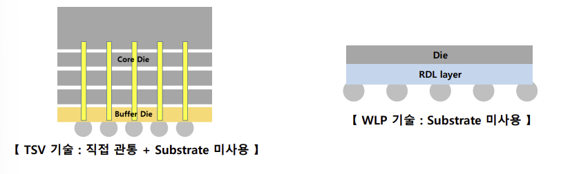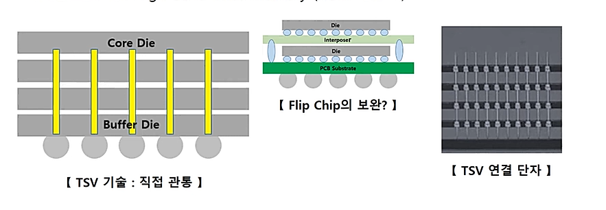 - THROUGH SILICON VIA - TSV 기술: 칩 내부에 직접 관통하는 기술로 빠른 전기적 장점 및 다단구조에도 유리