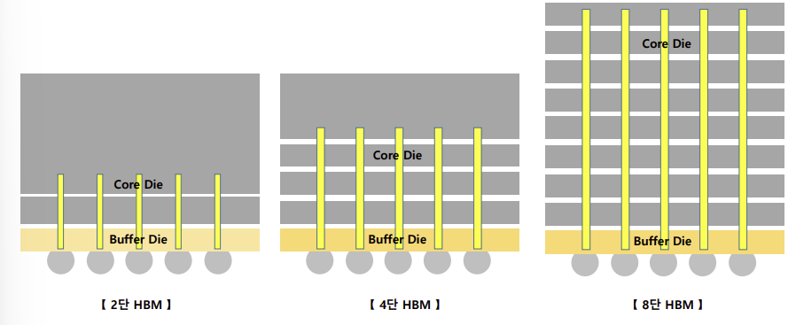 - 칩을 수직 연결해 전기적 연결 통로의 길이를 줄임으로써, 속도를 향상시키고 소비전력을 개선할 수 있다