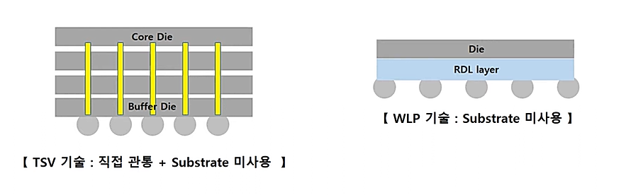 - WAFER LEVEL PACKAGE (WLP): PCB 기판을 사용하지 않고 바로 DIE에 전기적 배선을 만들어버리는 기술로 다단 적층에도 장점이 생김