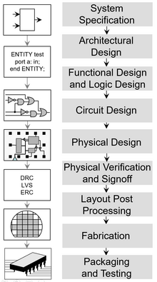 - RTL 설계: 이 단계는 사용자 사양(사용자가 칩이 수행하기를 원하는 것)을 레지스터 전송 레벨(RTL) 설명으로 변환한다. RTL은 칩 위의 디지털 회로의 정확한 동작과 입력 및 출력에 대한 연결을 설명한다.
