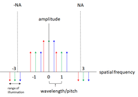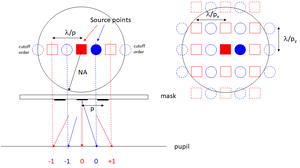 부분 간섭 하의 회절 스펙트럼 부분 간섭 조건에서 선-공간 패턴(피치<3 파장/NA)의 회절 스펙트럼(3차 회절까지)은 다양한 조명 각도를 나타내는 서로 다른 색상으로 표시된다.