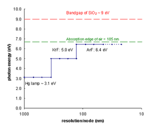 UV 엑시머 레이저는 약 126nm(Ar2*용)까지 입증되었다. 수은 아크램프는 50~150V의 일정한 직류 전류를 유지하도록 설계되지만, 엑시머 레이저는 더 높은 해상도를 가집니다. 엑시머 레이저는 전기장에 의해 충전되는 불활성 및 할로겐 가스(Kr, Ar, Xe, F, Cl)로 채워진 기체 기반 광 시스템이다. 주파수가 높을수록 이미지 해상도가 높아집니다. KrF 레이저는 4kHz의 주파수로 작동할 수 있 수은 아크램프보다 고주파로 작동할 뿐만 아니라, 엑시머 레이저는 더 진보된 기계와도 호환된다. 또한 더 먼 거리(최대 25m)에서 작동하고 일련의 거울과 항반사 코팅 렌즈로 정확도를 유지할 수 있다.러 레이저와 거울을 설치하면 에너지 손실을 최소화할 수 있으며, 렌즈에 항반사 코팅이 되어 있어 레이저에서 나온 빛의 강도가 웨이퍼에 도달할 때까지 거의 변하지 않는다.