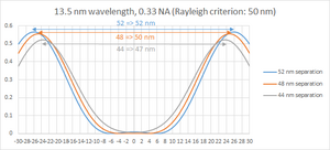 이 방정식에 따르면, 최소 특징 크기는 파장을 줄이고 수치 조리개를 높여 줄일 수 있다. 그러나 이 설계 방법에는 상충되는 제약이 있 현대 시스템에서 초점 심도도 문제가 된다: