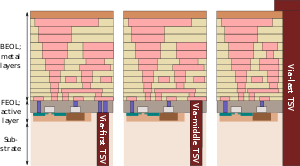 제조 공정에 따라 세 가지 유형의 TSV가 존재한다. via-first TSV는 개별 구성 요소(트랜지스터, 커패시터, 저항기 등)가 패턴화되기 전에 제작되며, via-middle TSV는 개별 구성 요소가 패턴화된 후 금속 층(후면 공정)이 형성되기 전에 제작되고, via-last TSV는 후면 공정 중 또는 후에 제작된다. 중간 비아 TSV는 현재 고급 3D IC 및 중간층 스택에 널리 사용되고 있다.